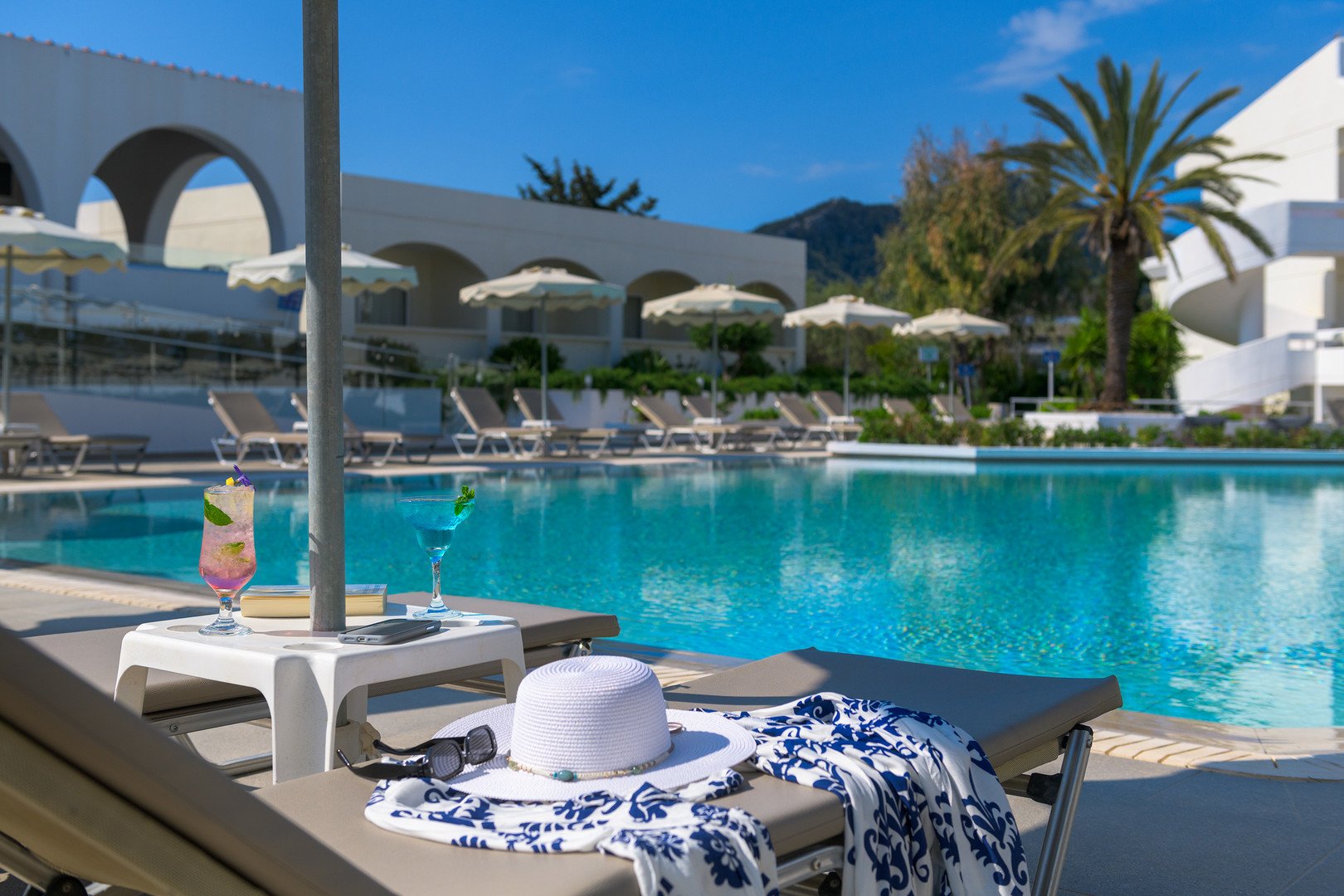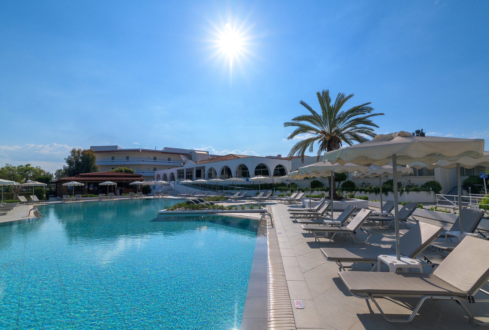 Úszómedence (édesvíz, kb. 350 m², mélység kb. 1,4 m) és egy gyermekmedence (mélysége kb. 0,4m). Az itt található törölközők és napozóágyak pedig kaucióval vehetőek igénybe. Ingyenes: darts, asztalitenisz és játszótér. Térítés ellenében: teniszpálya (felszerelés kölcsönzéssel) és biliárd. Görög est: heti rendszerességű, autentikus görög zenével és hagyományos táncokkal.